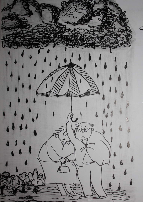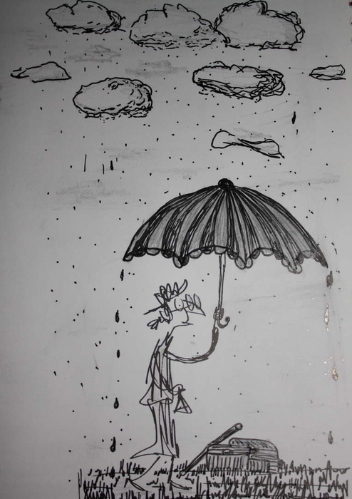 Die Personen sind jeweils vorgegeben, nun sind Wolken, Regen und Schirme einzuzeichnen.